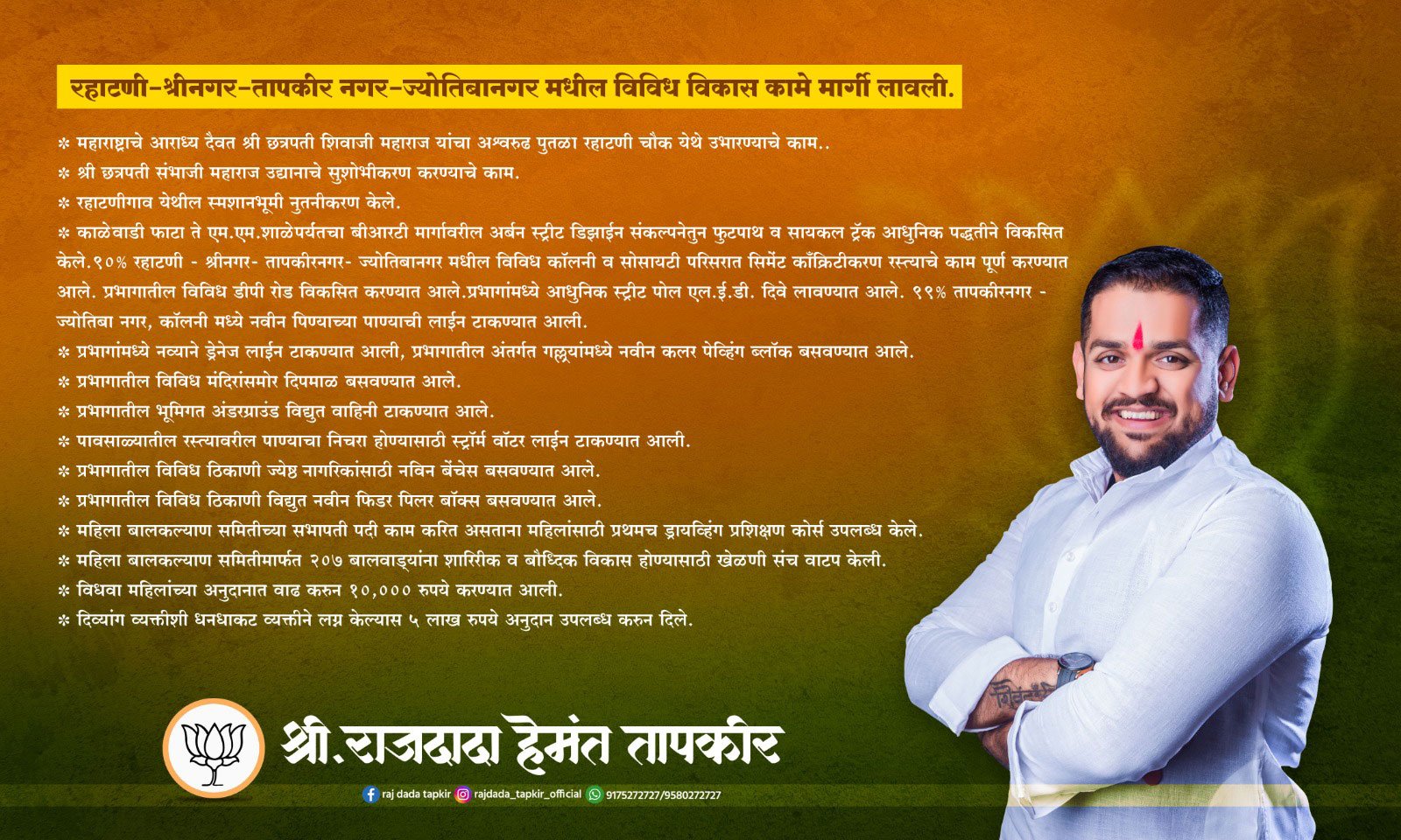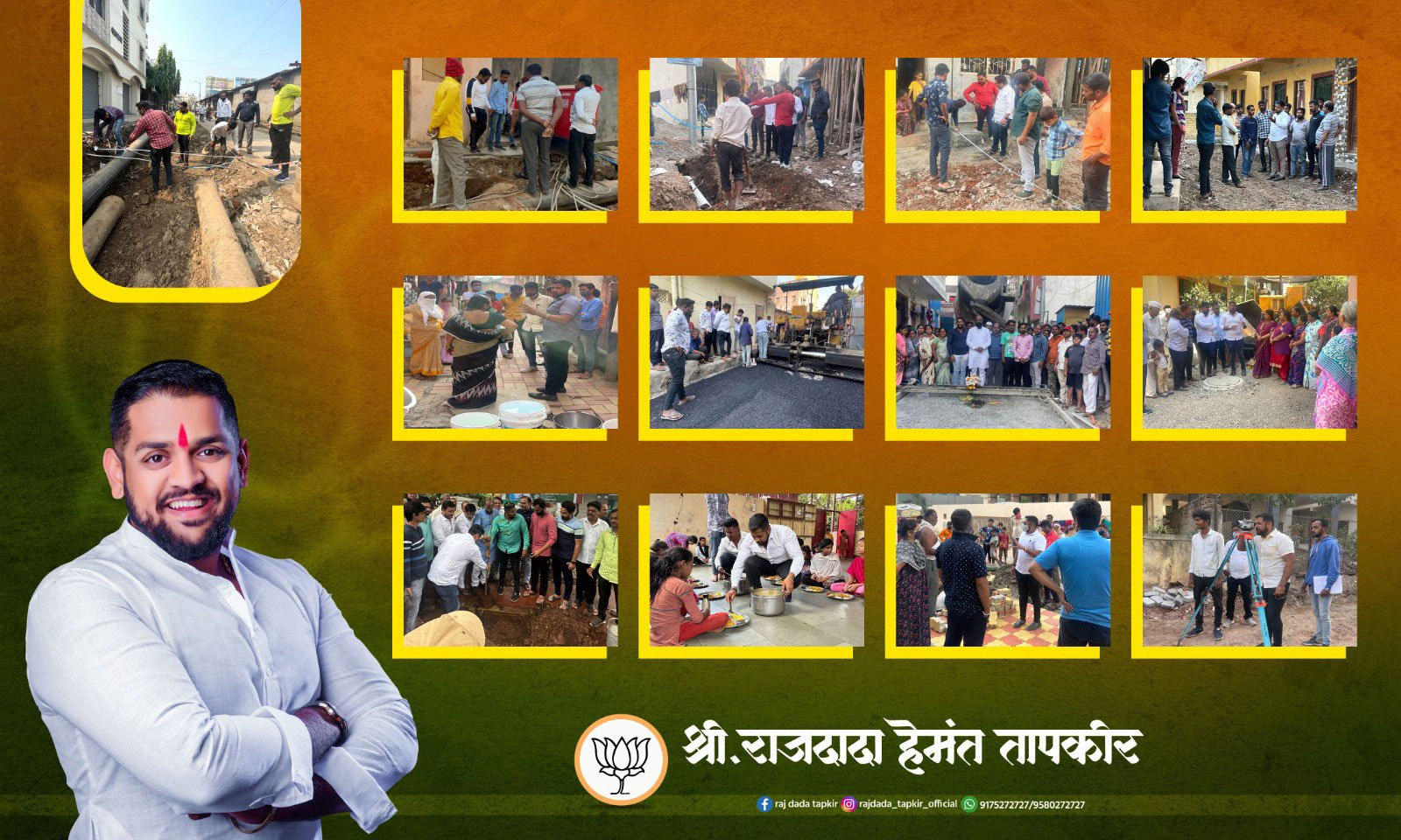 त्यामुळे समाजसेवा च राजकारण हे राज यांच्या नसानसात भिनले आहे. मागील पाच वर्षात रहाटणी श्रीनगर-तापकीरनगर प्रभागात या आगोदर झाला नव्हता तेवढा विकास त्यांच्या आई माजी नगरसेविका सुनिता तापकीर व त्यांचे सासरे माजी नगरसेवक चंद्रकांत आण्णा नखाते यांनी केला. महाराष्ट्राचे आराध्य दैवत श्री छत्रपती शिवाजी महाराज यांचा अश्वरूढ पुतळा रहाटणी चौकात उभारण्यात आला. श्री छत्रपती संभाजी महाराज उद्यानाचे सुशोभीकरण, प्रभागातील डीपी रस्त्यांचा विकास, रस्त्यांचे काँक्रिटीकरण, नव्याने ड्रेनेज व पिण्याच्या पाण्याच्या वाहिन्या, पेव्हिंग ब्लॉक, एलईडी पथदिवे, काळेवाडी फाटा ते एमएम शाळेपर्यंतचा बीआरटी मार्गावरील अर्बन स्ट्रीट डिझाइन तसेच त्यांच्या संकल्पनेतून फुटपाथ व सायकल ट्रॅक आधुनिक पद्धतीने विकसित केले. आदी कामे त्यांनी प्राधान्याने केली.