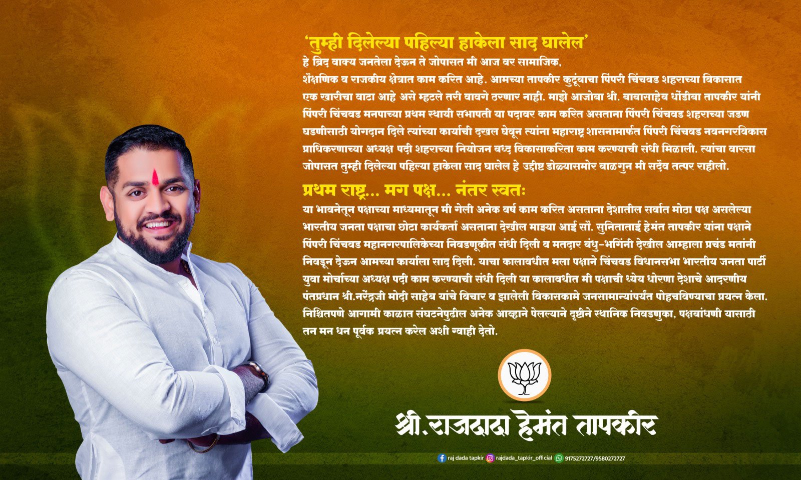 समाजकारण व राजकारणाचा वारसा लाभलेले रहाटणी-काळेवाडीतील युवा नेतृत्व म्हणजे राज सुनिता हेमंत तापकीर, राज तापकीर यांना समाजसेवा व राजकारणाचे बाळकडू आपले आजोबा श्री बाबासाहेब धोंडीबा तापकीर, वडील श्री हेमंत बाबासाहेब तापकीर व चुलते श्री हरेश बाबासाहेब तापकीर यांच्याकडून मिळाले. त्यांचे आजोबा हे पिंपरी चिंचवड महानगरपालिकेचे प्रथम नगरसेवक, स्थायी समितीचे प्रथम अध्यक्ष व पिंपरी चिंचवड नवनगर विकास प्राधिकरणाचे प्रथम अध्यक्ष होते.